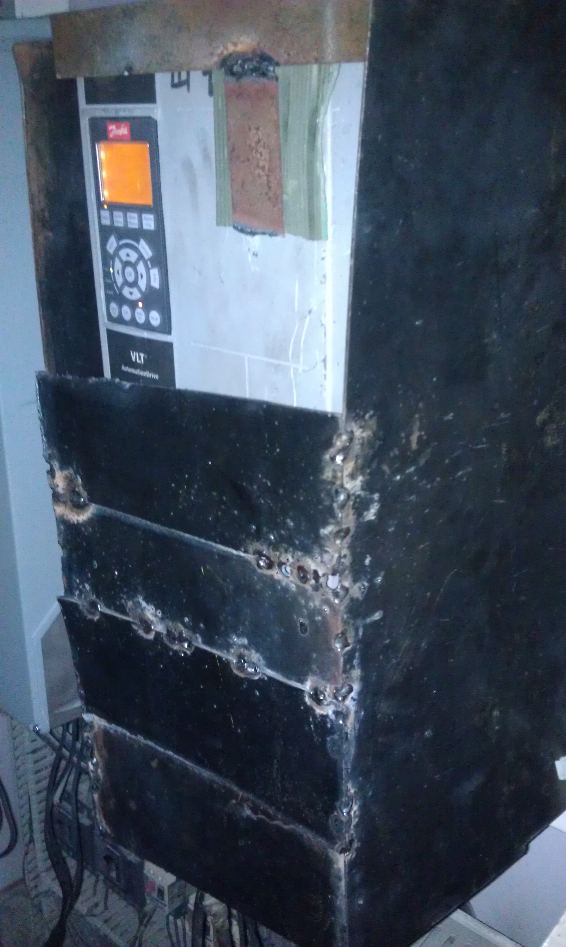 最后通過以上分析,現(xiàn)場服務工程師決定對新變頻器做一個磁場屏蔽的實驗,做一個鐵的環(huán)形屏蔽,如圖所示,設備重啟后馬上就運行正常了,并且連續(xù)運行了16個小時,期間無任何故障報警,一切運轉(zhuǎn)正常。